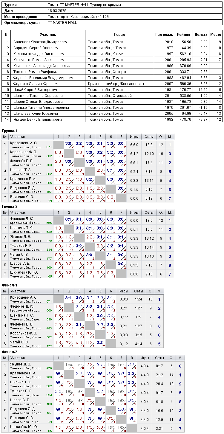 Результаты турнира в среду 18 марта 2026