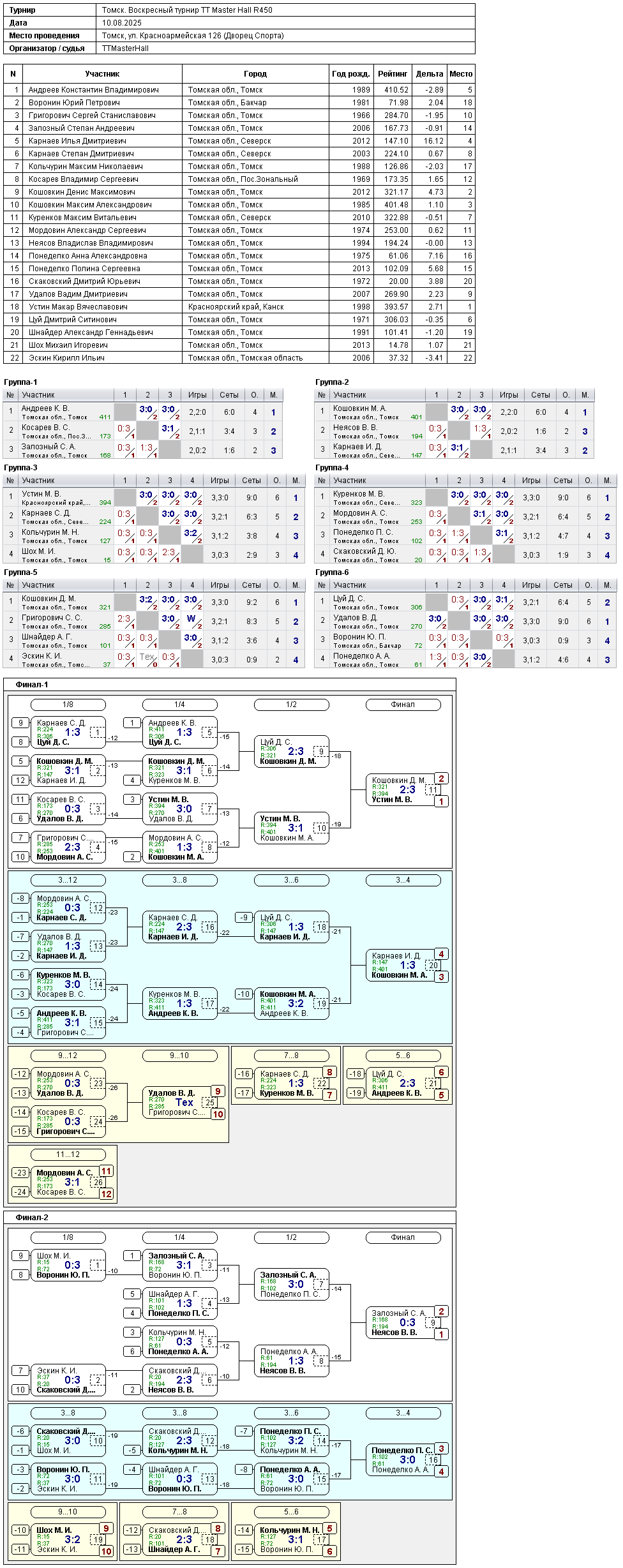 Результаты вечернего турнира 10 августа 2025