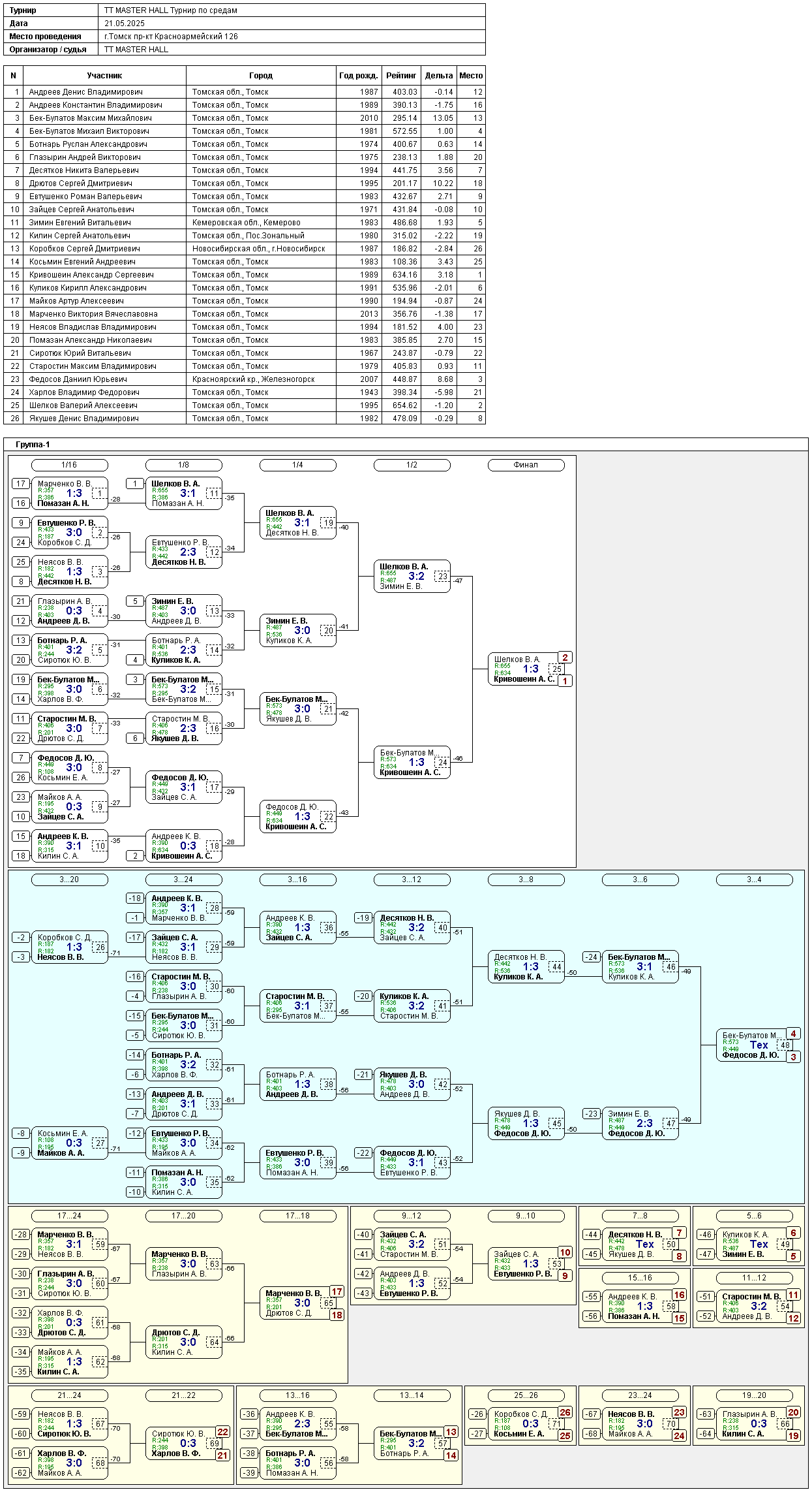 Результаты турнира в среду 21 мая 2025